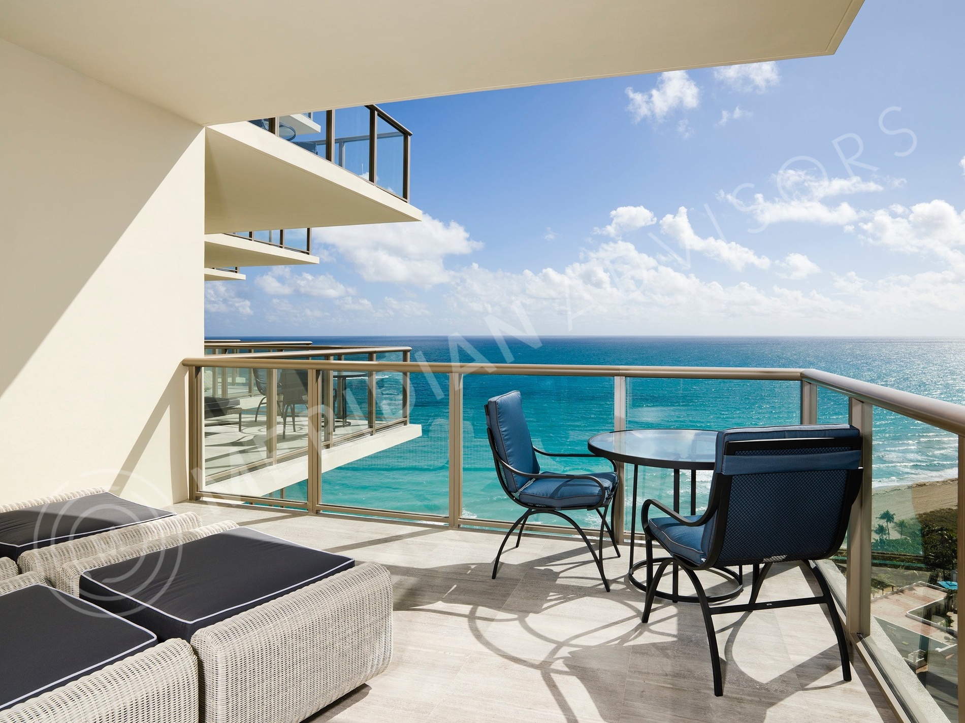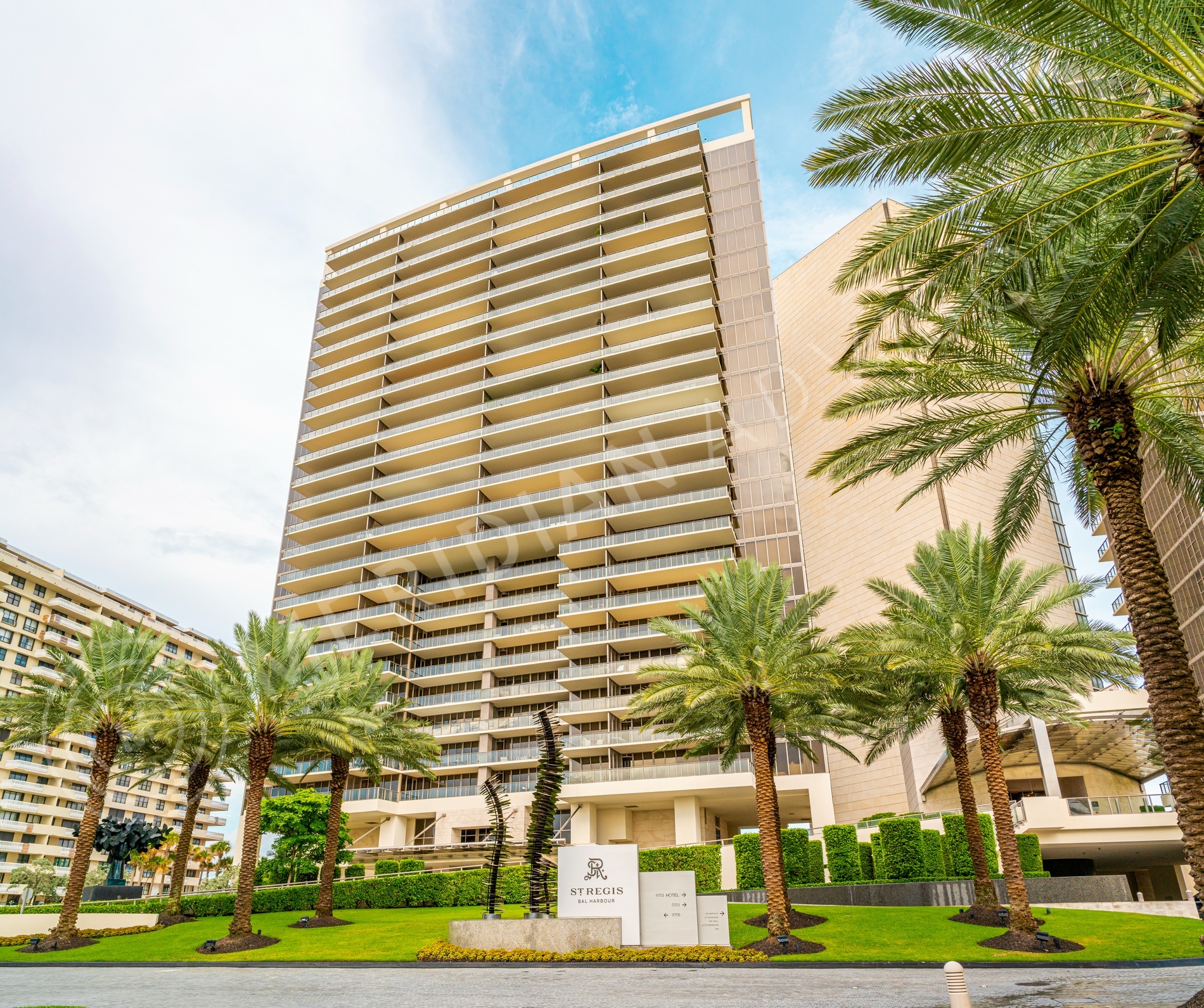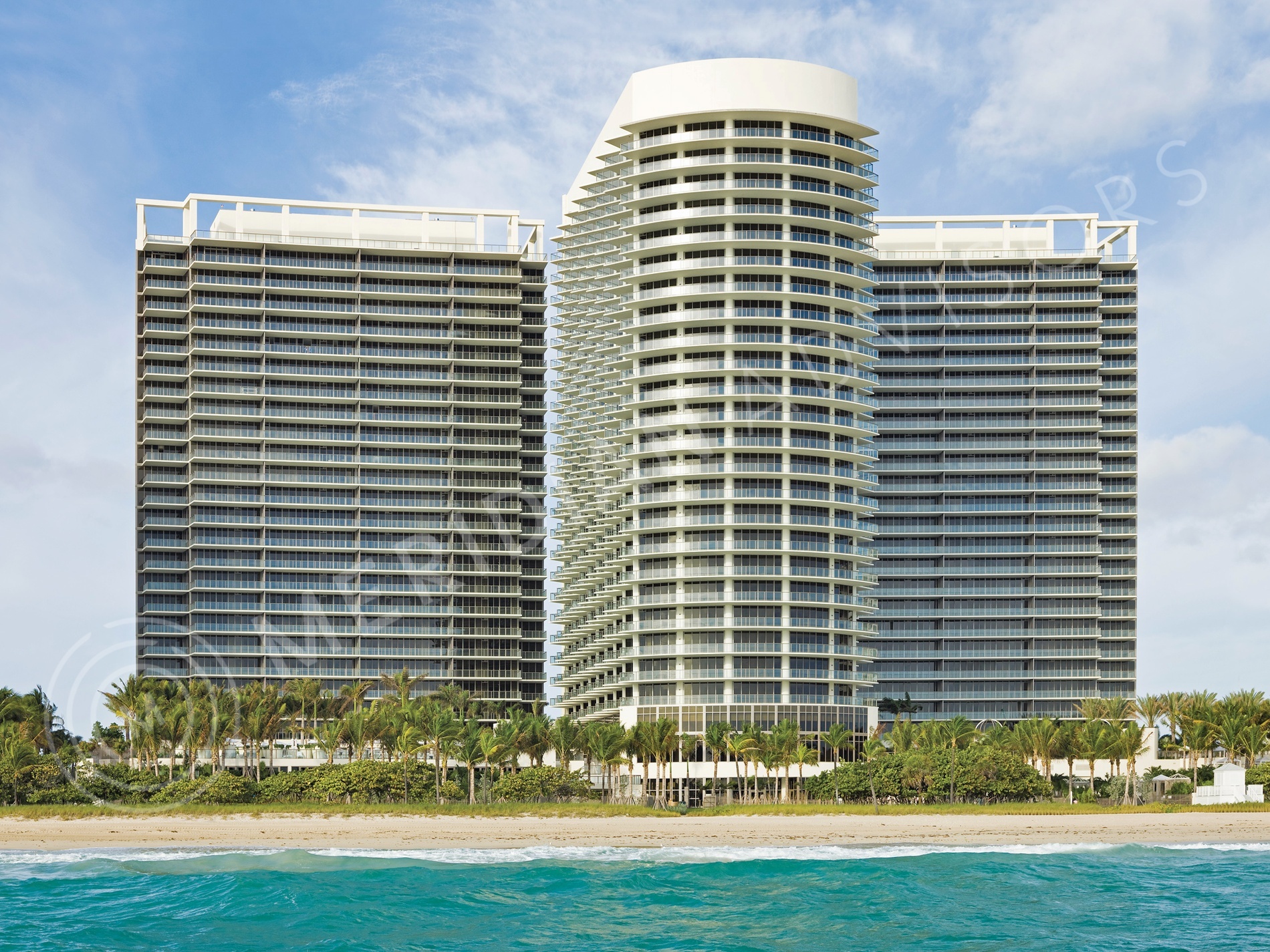 As you approach Bal Harbour’s St. Regis Residences, the property’s lavish entry experience greets you warmly, with elaborate fountains and reflecting pools along a dramatic approach drive. The St. Regis’s sprawling gardens surround a trio of towers, consisting of two residential buildings and a central hotel. Along the property’s sensational 600 linear feet of manicured beachfront, the beautiful people of Bal Harbour relax and take their hair down among the aquamarine waters of the Atlantic Ocean.
